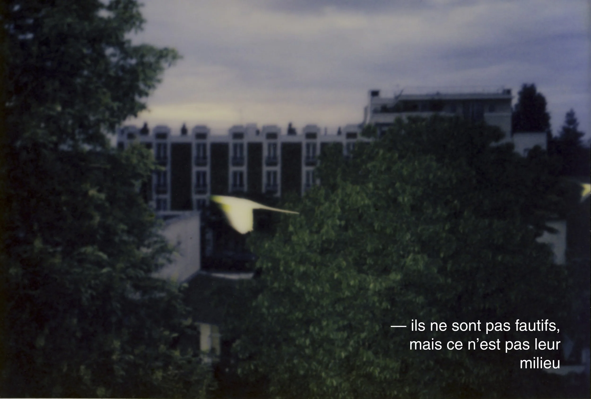Halfway between a scientific undertaking and a poetic reverie, Rebecca Topakian’s series (n=6-9) explores the Greater Paris area through exotic birds: the rose-ringed parakeets who escaped from Orly airport in 1974 and have multiplied to over eight thousand. Working with ethologists, the artist captures their flight using infrared photography and reproduces the images on large silk panels. On each of them, she prints phrases taken from various social networks, revealing how differences are perceived and the social inequalities this generates.