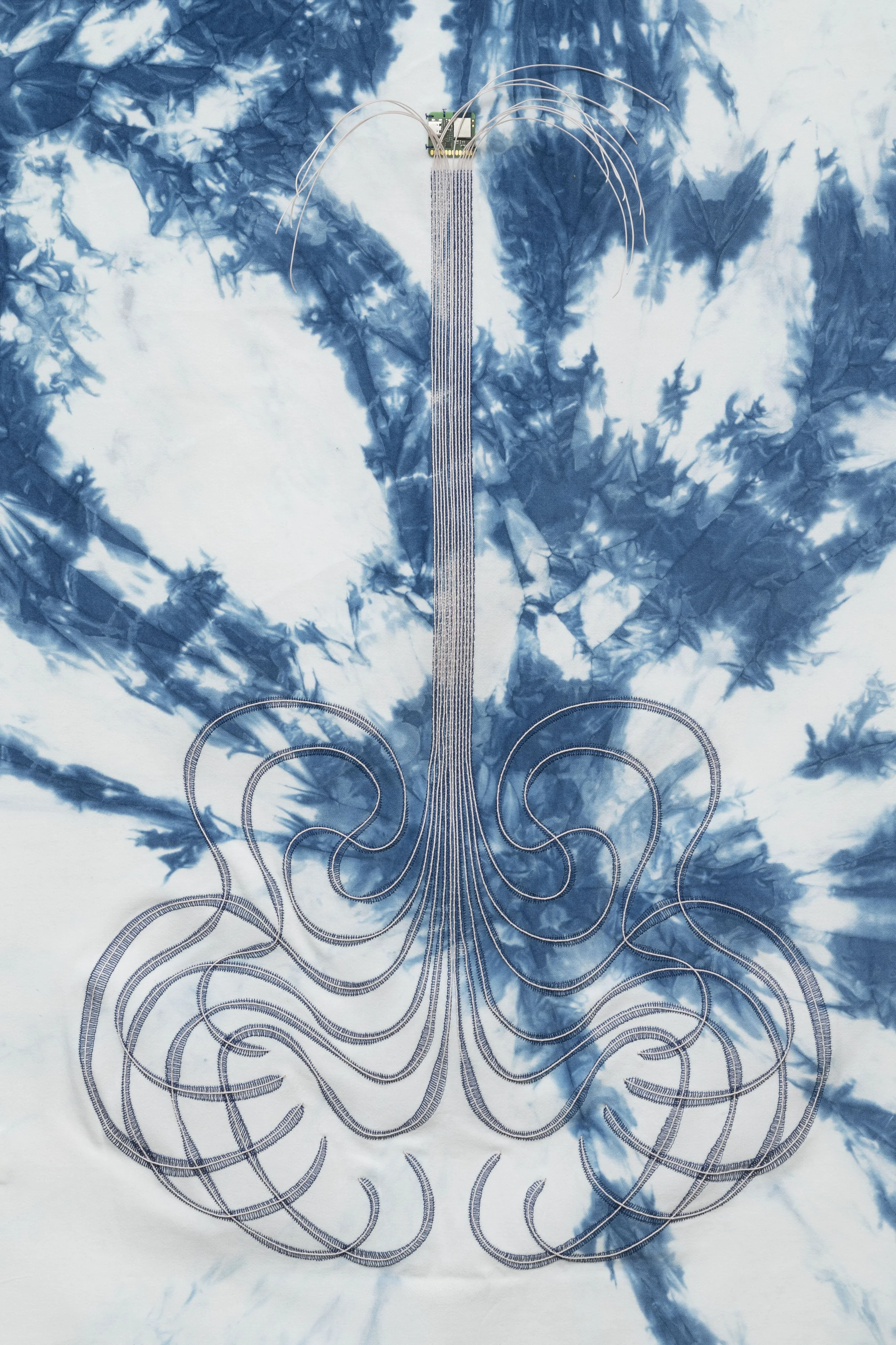 Embroidered Touch by Anke Loh enables the visitor to create an individual sensory experience using sound and touch. Insulated wires embroidered on the textiles in a grid pattern sense the visitor’s touch. Sound files of field recordings from urban spaces and nature walks, plus recorded string and percussion instruments respond to touch. The wires function as touch sensors that elicit soothing sounds. Visitors are invited to wander through sound and touch to create an individual soundscape for a healing sensation.