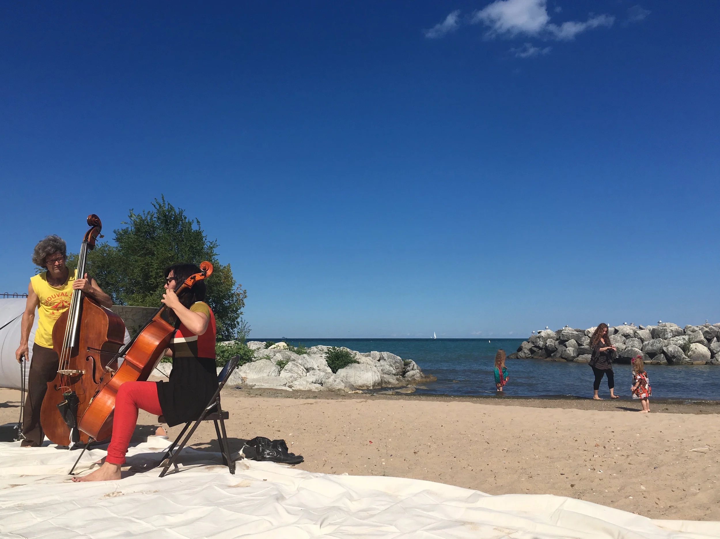 Experimental performances involving water on the water next to Berger Park beach including Josh Abrams, Lisa Alvarado, Matthew Hale Clark, Carol Genetti, and others.